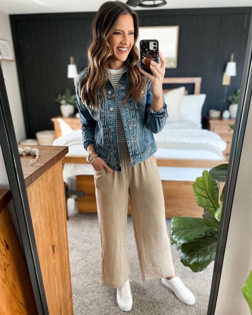 Relaxed neutrals with a blue denim jacket always feel fresh and approachable—this look leans into cozy chic without sacrificing polish.