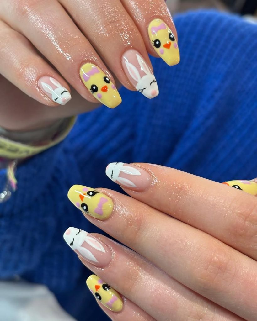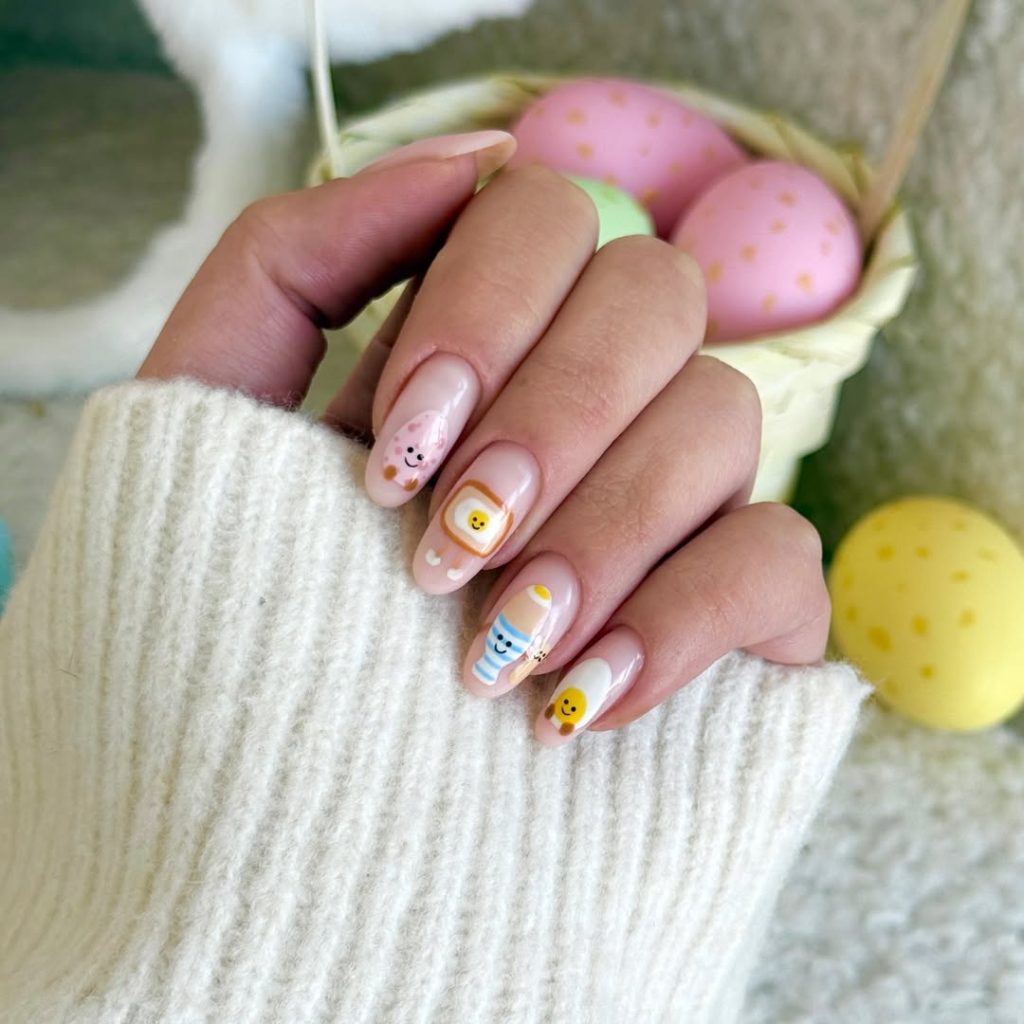 This manicure feels like a modern twist on a French Design, but with a delightful Easter surprise. Soft nude bases are finished with speckled tips in Yellow, Pink, lilac, and white, mimicking cracked eggshells. One tiny chick peeking out adds just the right amount of personality without overwhelming the look.