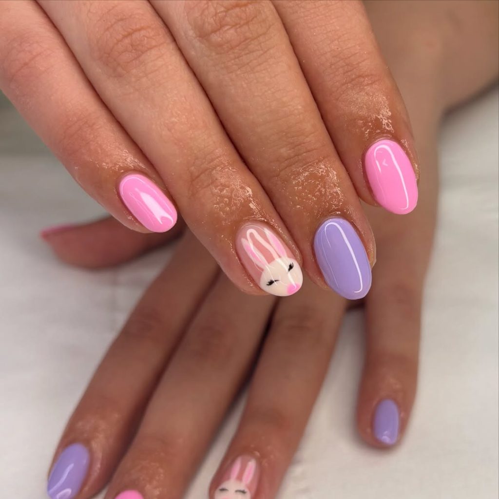 Sometimes less really is more. These glossy pink and lilac nails have a clean, modern Easter vibe, with just one adorable bunny accent as the focal point. The bold Color contrast feels fresh and confident, while the tiny bunny Art adds a whisper of sweetness without overwhelming the look.