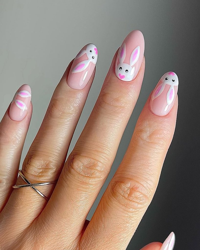 There’s something so delicate and dreamy about these soft Pink Almond nails with hand-painted bunny faces. The matte-like finish softens the look, while subtle white and blush details create a gentle, romantic feel. This design is sweet without being childish, embodying more refined Easter elegance than cartoonish cuteness.
