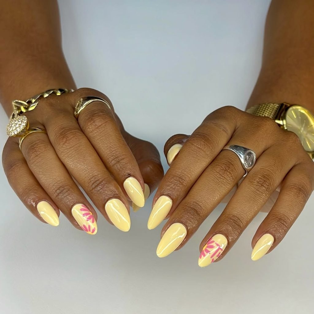 There’s something so uplifting about buttery Yellow nails in the spring. This glossy Almond set feels like the first warm day after a long winter—bright, optimistic, and full of possibility. The subtle Pink floral Designs on the accent nails add just enough Art to keep things captivating without distracting from that creamy, sunshine-inspired Color.