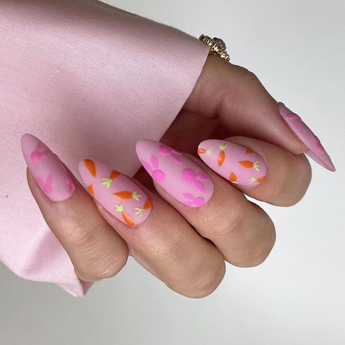 These matte Pink nails are pure spring sweetness. Tiny carrot Designs and subtle bunny silhouettes give this set a whimsical twist, while the velvety finish softens the entire look. It feels playful but still grown-up—like you’re embracing the holiday in a chic, fashion-forward way.