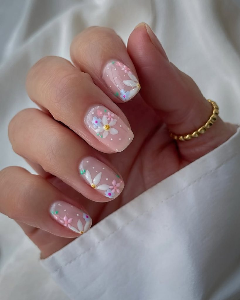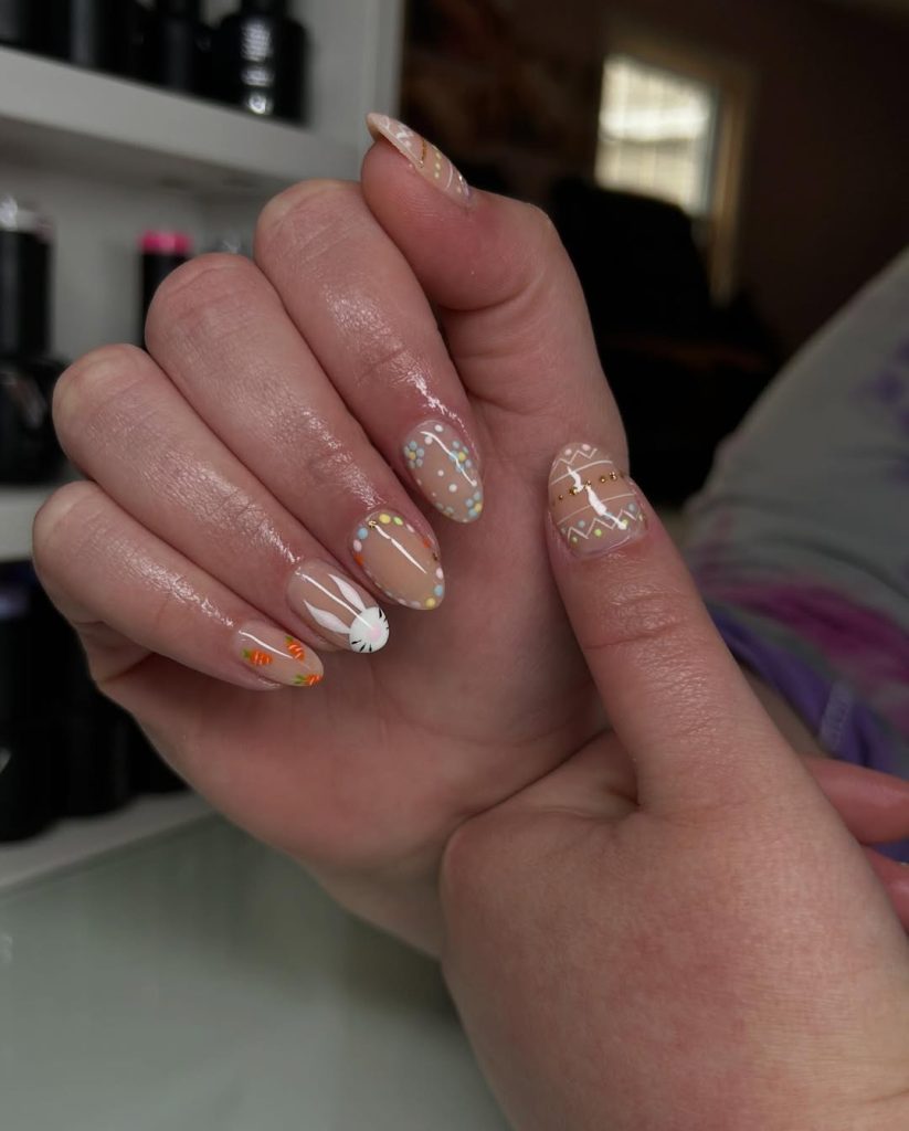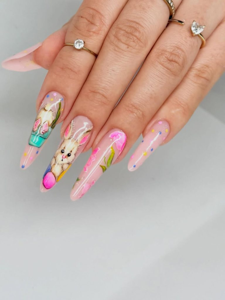 There’s something quietly charming about this sheer nude base with delicate dotted Designs and a tiny bunny accent. It feels subtle and elegant, like Easter whispered rather than shouted. The transparent effect gives the nails a barely-there glow, while soft Pastel dots add just enough Color to catch the light.
