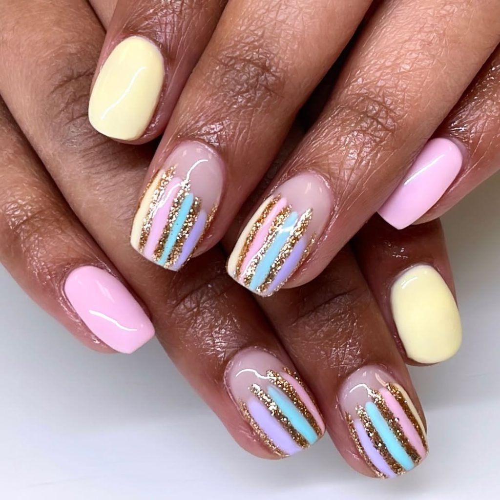 This manicure is perfect for those who enjoy adding a touch of sparkle to their spring shades. Soft Pink and buttery Yellow is paired with delicate vertical stripes in Blue, lilac, and shimmery gold. The glitter-lined Designs feel festive without being loud, like Easter eggs dressed up for a special brunch. It’s polished, playful, and just a touch glamorous.