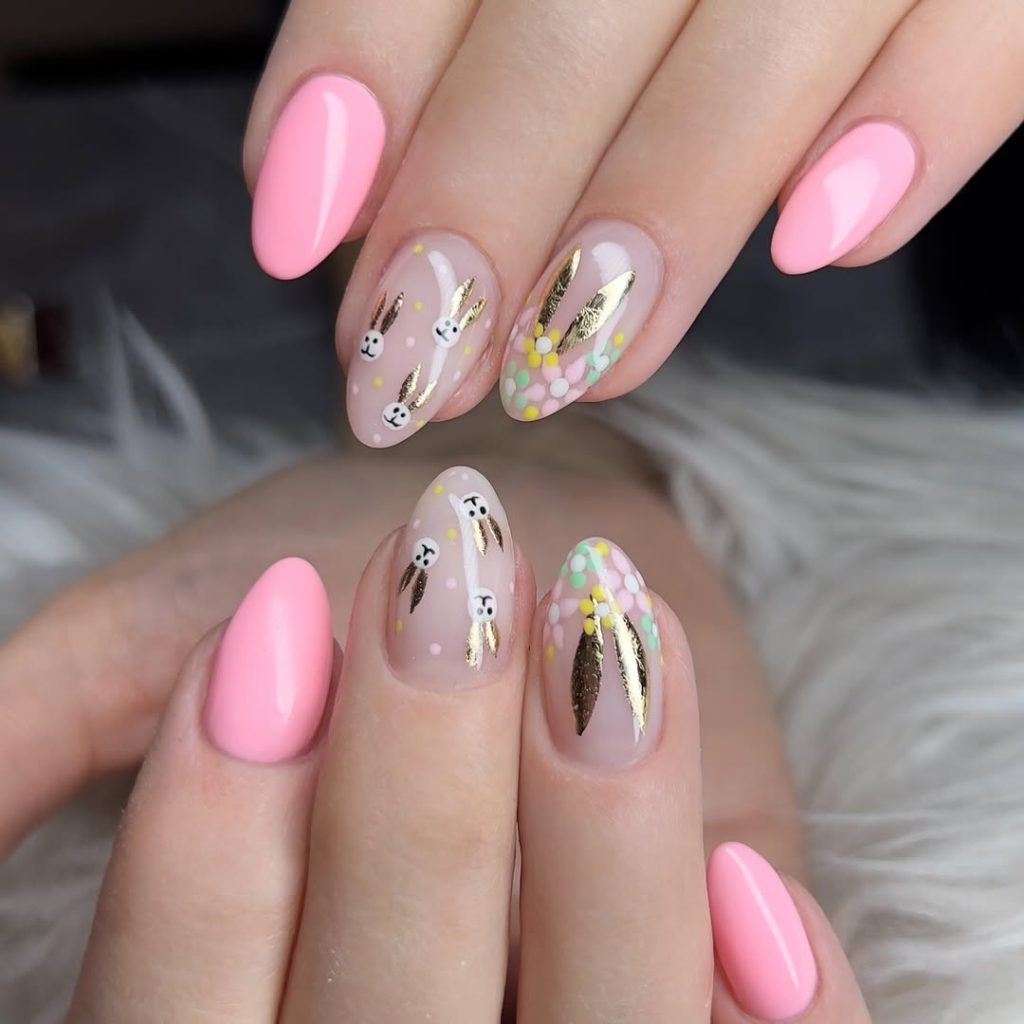 These glossy Pink nails have pure spring sweetness with a luxe twist. Delicate bunny Designs sit on a sheer base, accented by shimmering gold foil and tiny confetti-like dots. The combination of Cute character Art and metallic detailing creates a look that feels both playful and elevated.