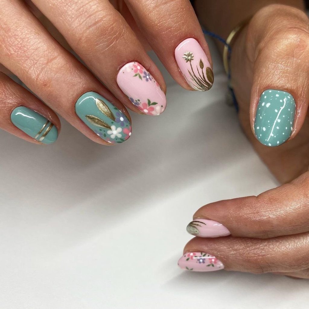 This manicure evokes the essence of a blossoming spring garden. Soft Pink and muted Green nails are paired with delicate floral artwork and subtle gold detailing, creating a fresh and romantic Color scheme. The combination of solid shades and detailed Designs keeps the look balanced and beautifully cohesive.
