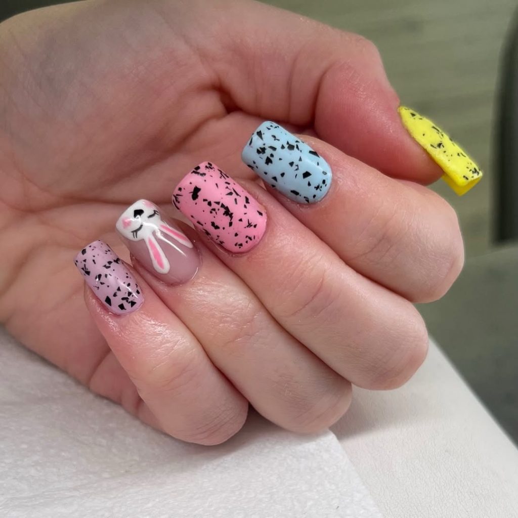 These Almond nails look just like delicate Easter eggs scattered across the table. Soft Pastel Colors—Pink, mint Green, buttery Yellow, and baby Blue—are finished with speckled black detailing for that authentic egg-inspired Design. The texture effect gives the manicure dimension and a slightly artsy twist.