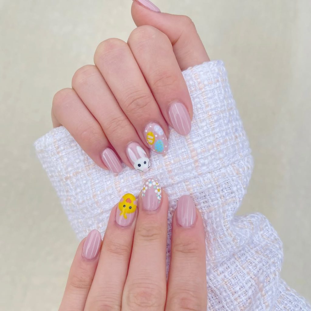 These glossy blush nails feel like the sweetest surprise of Easter morning. The soft pink base keeps everything polished and feminine, while tiny bunnies and egg designs add a playful holiday touch without going overboard. Mixing delicate stripes with miniature Art details creates a charming effect that feels thoughtful, cute, and quietly joyful, as if you’ve meticulously planned every detail of your look.