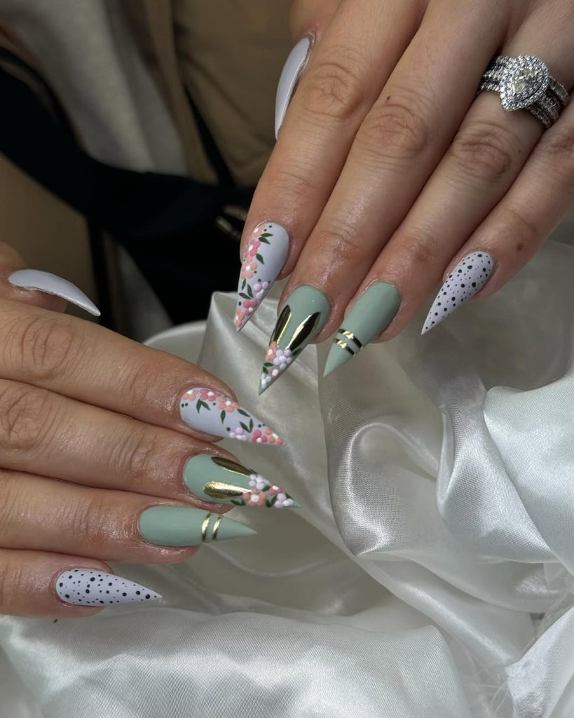 This manicure is pure drama in the best way. The elongated stiletto shape paired with muted greens and soft whites creates a striking contrast that feels elevated and fashion-forward. Floral Designs and subtle speckled details give it that Easter nod, while gold accents add a touch of glamour. It’s the kind of look that turns heads across the table.