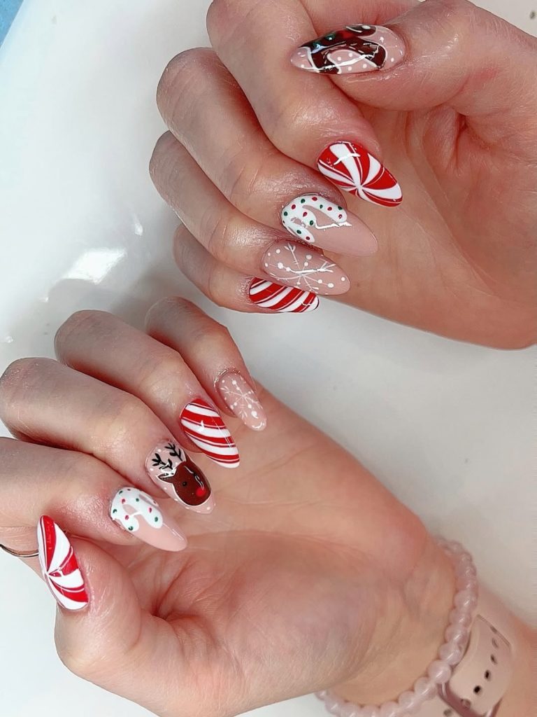 The look works beautifully on almond nails with a glossy gel finish to highlight the bright colors. It’s a fun Christmas nails 2025 idea that’s both cute and creative, giving plenty of inspo for mixing art and classic holiday shades.