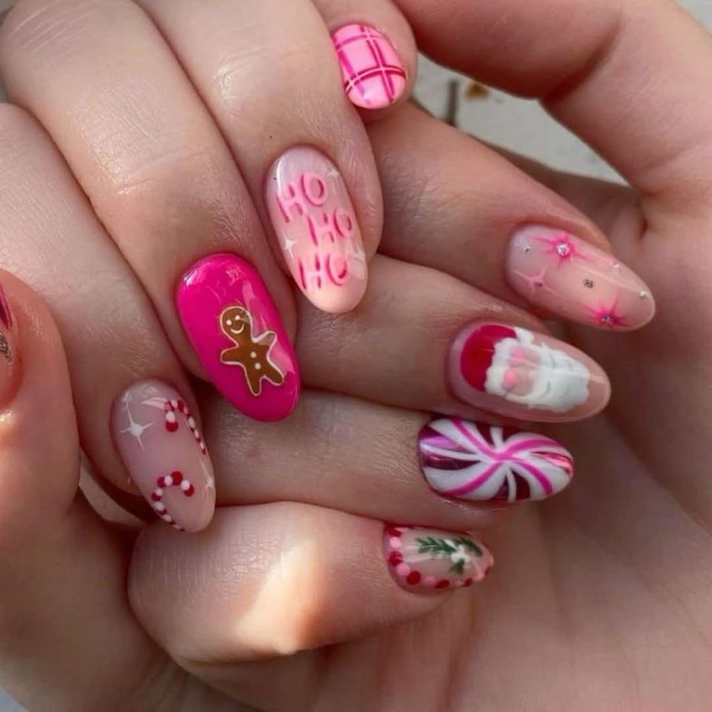 With candy canes, peppermint swirls, Santa Claus, and even a gingerbread man, this pink-themed set flips the script on traditional holiday nails. It’s youthful, unexpected, and undeniably cute — ideal for someone who loves to stand out during the holidays.