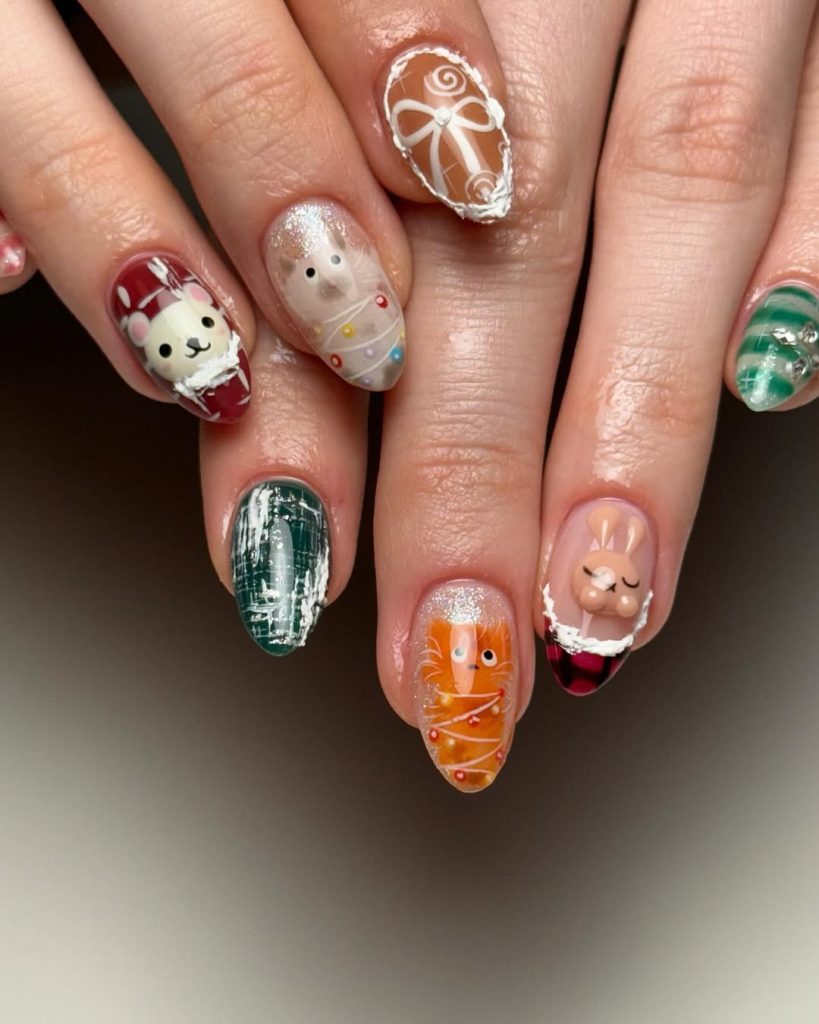 This set feels like a playful Christmas cartoon brought to life on your fingertips. With cute characters like a bunny, a bear, and even a kitty tangled in holiday lights, the design radiates cheer and lighthearted fun. Each nail tells a mini story, making it perfect for anyone who loves personality-filled art.