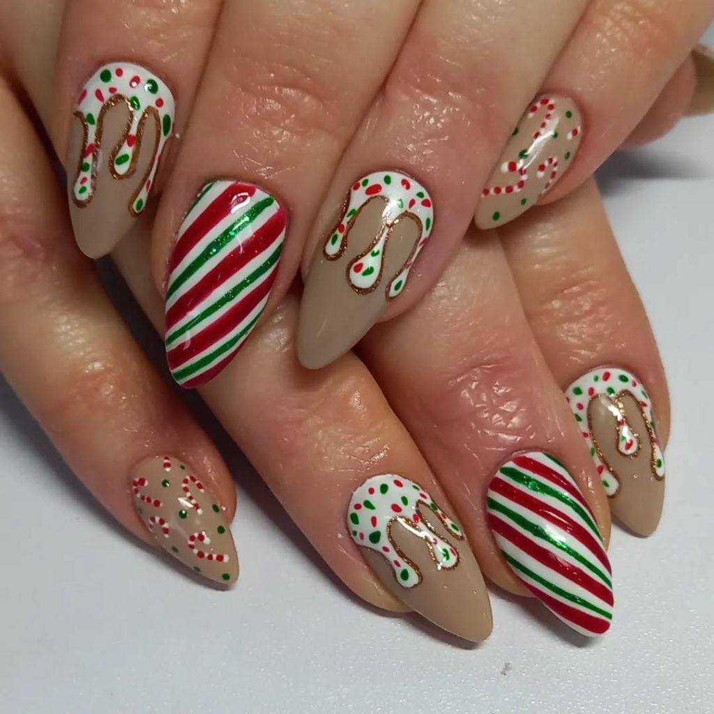 Here’s a sweet twist on holiday classics: red and green stripes paired with dripping candy-inspired tips. The glossy beige base makes the festive colors pop while keeping the whole look polished and stylish.