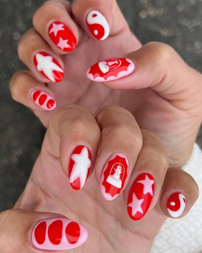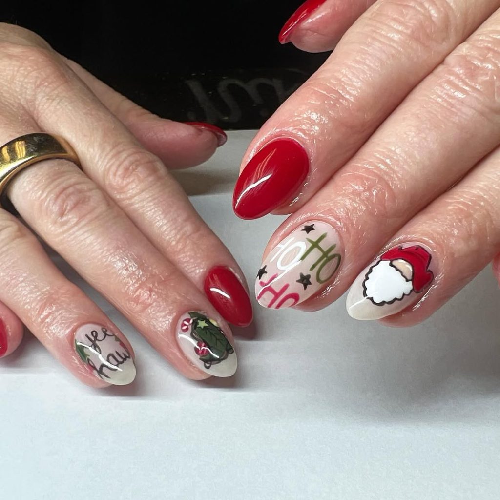 These nails look stunning on medium almond shapes, giving enough room for bold designs. A gel polish finish makes the red shine beautifully, and the mix of playful shapes offers endless inspo for anyone who wants Christmas nails that feel more artistic than traditional.