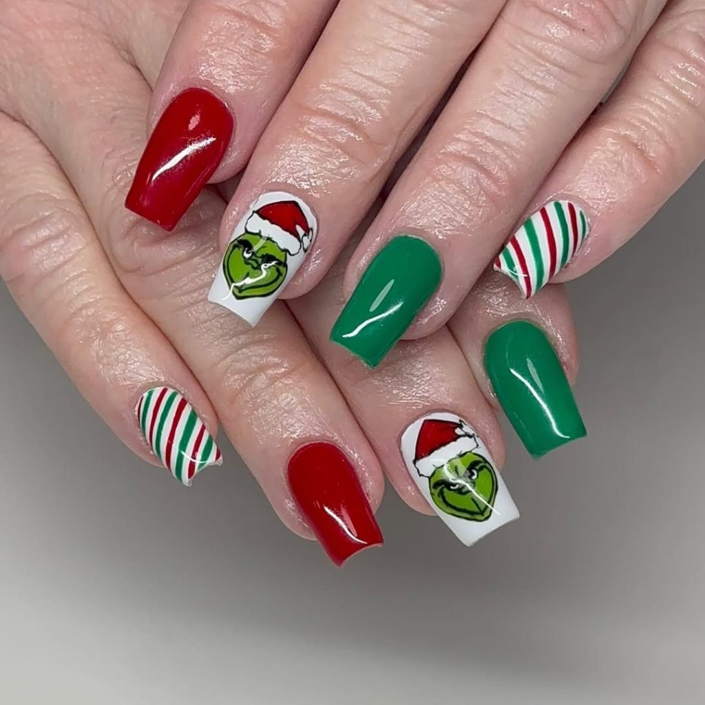 For those who love a cheeky twist, these Grinch-inspired nails are the ultimate conversation starter. Red, green, and candy cane stripes mix perfectly with the mischievous Grinch face, balancing humor with holiday cheer.
