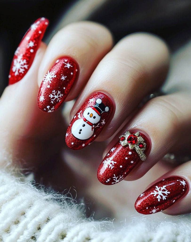 Perfect for almond shapes, this look is great in gel for a glossy finish that keeps the colors bold. The fun Christmas nails 2025 vibe makes it ideal for anyone who loves mixing cute art designs with timeless red nails.