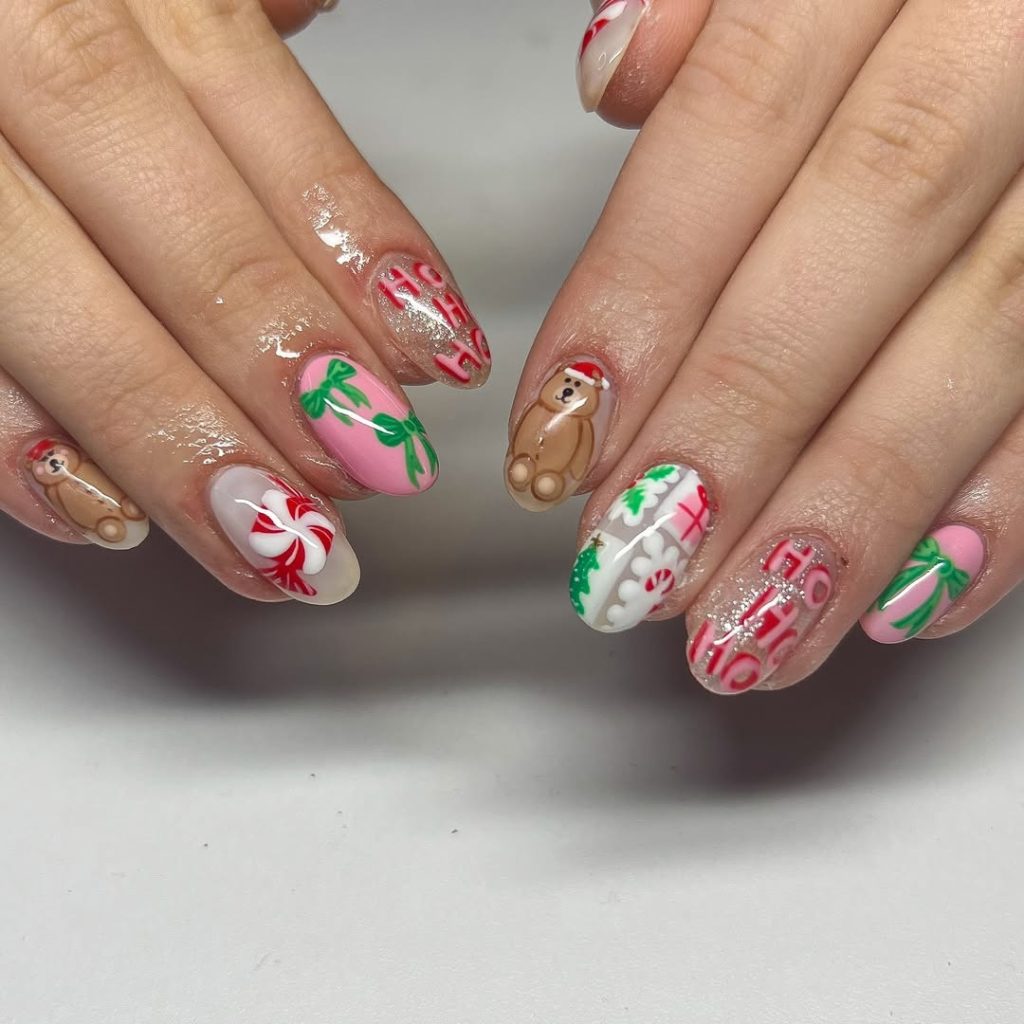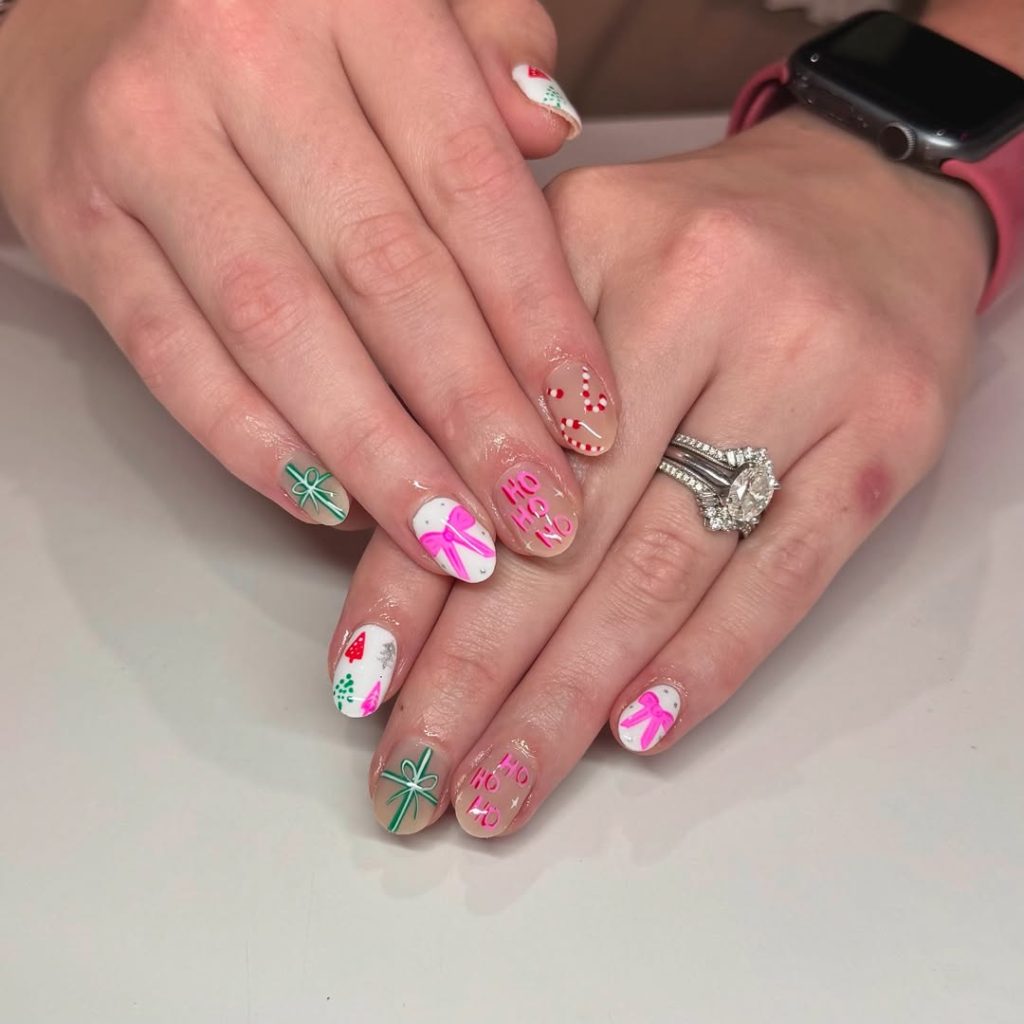 Soft pinks and whites give these nails a fresh twist on traditional holiday colors. With bows, candy canes, Christmas trees, and “Ho Ho Ho” details, it feels playful and youthful — like pastel wrapping paper turned into nail art.