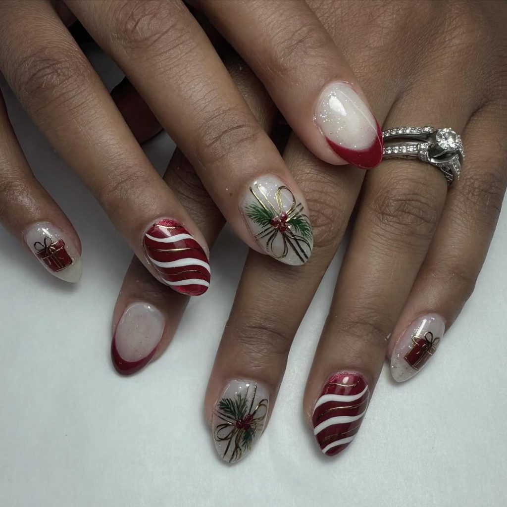 Shiny red stripes, golden gift boxes, and pine sprigs tied with delicate bows make this design elegant and festive. It’s the kind of manicure that feels like holiday décor wrapped into one set.