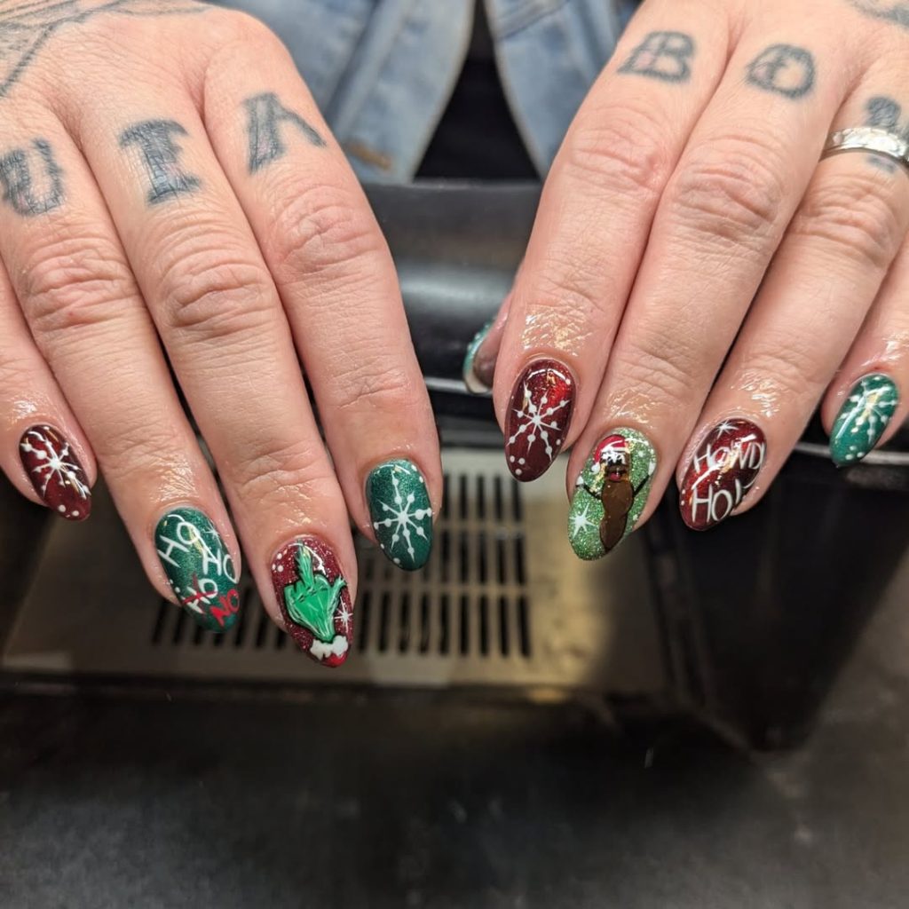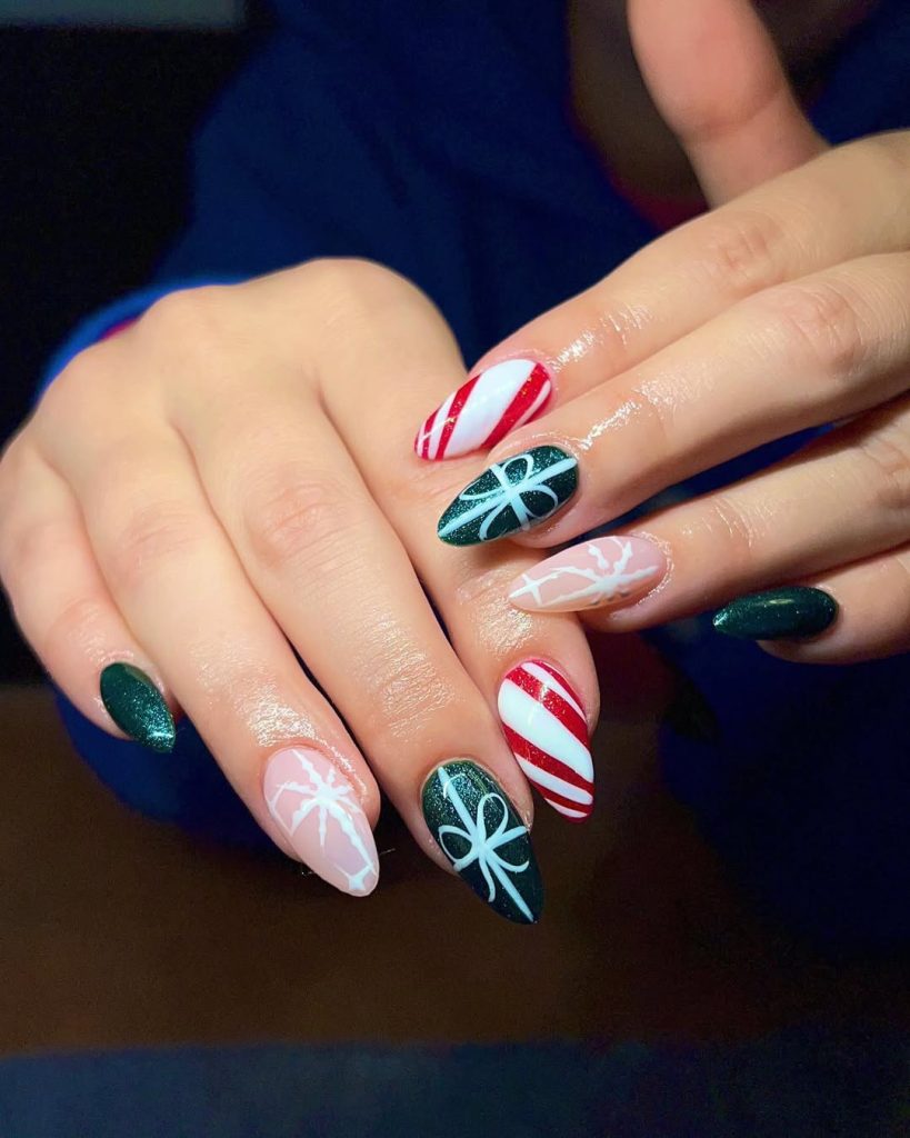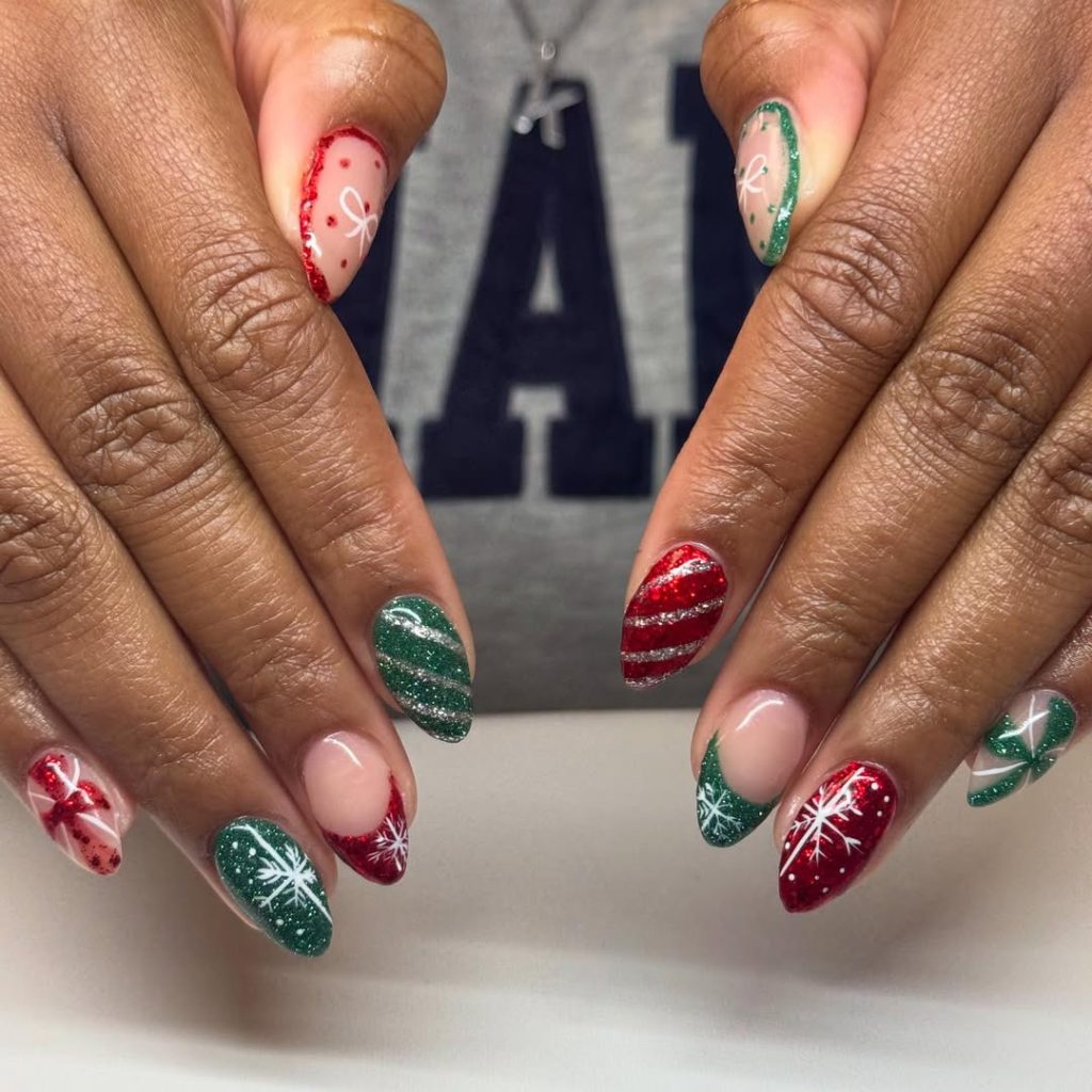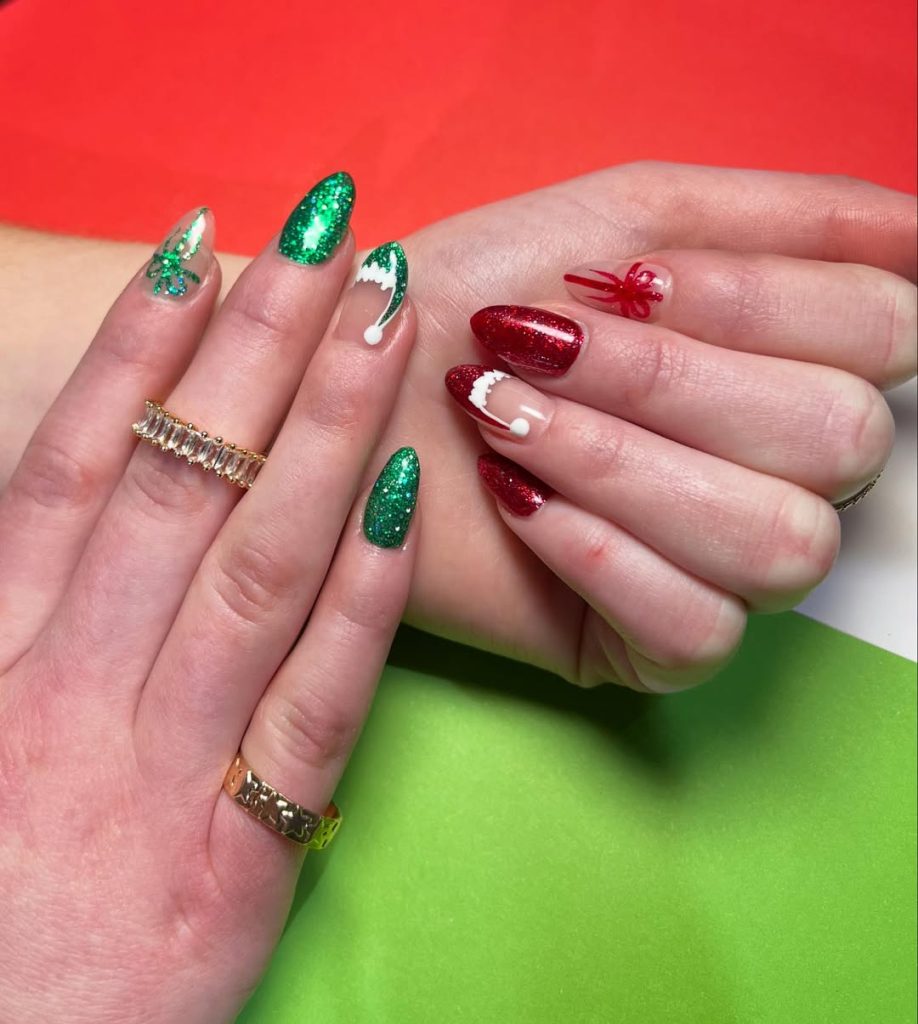 Sparkly greens and reds make these nails look like they’ve been sprinkled with holiday fairy dust. Paired with designs inspired by elf hats and Christmas ribbons, the whole set feels joyful, festive, and ready for fun nights by the tree.