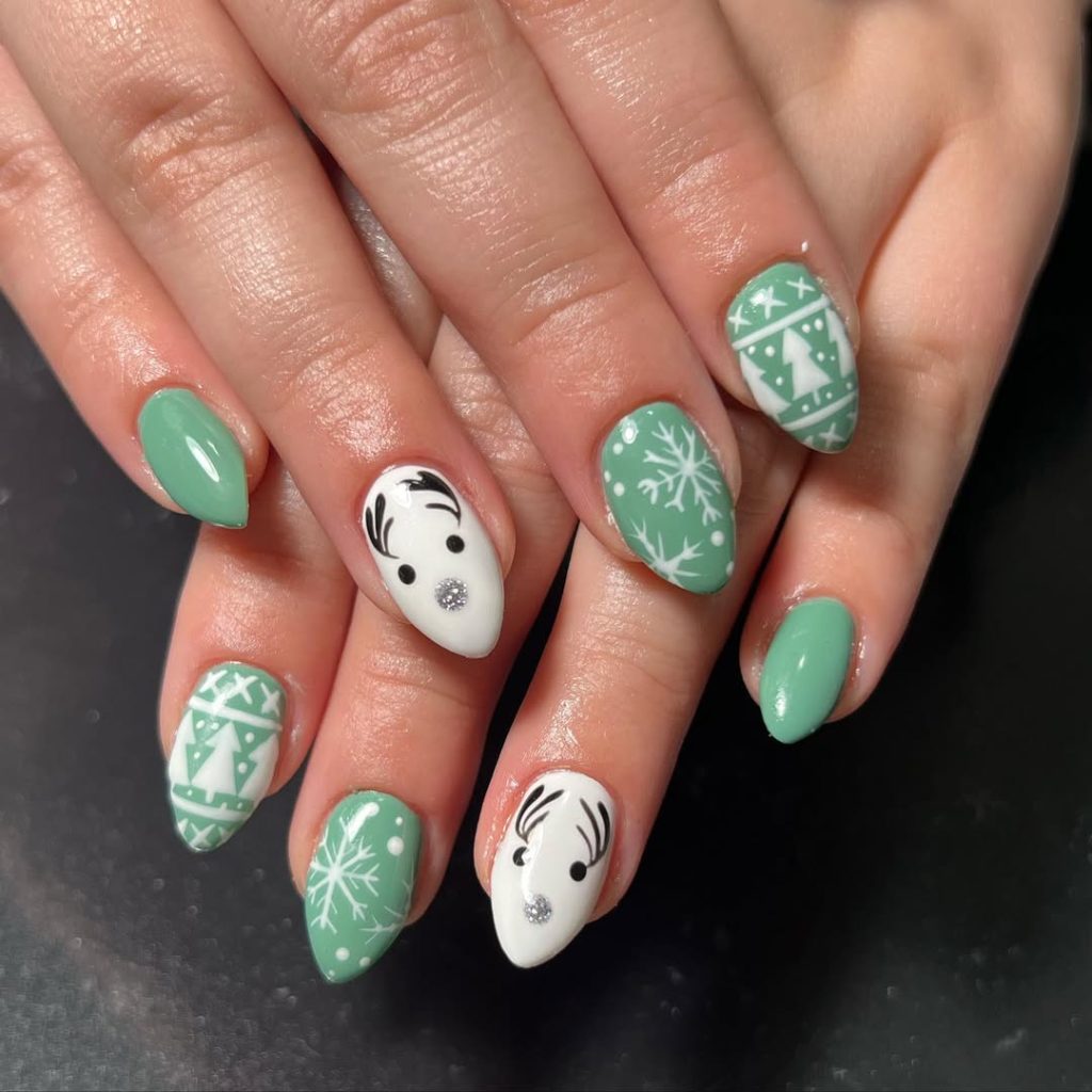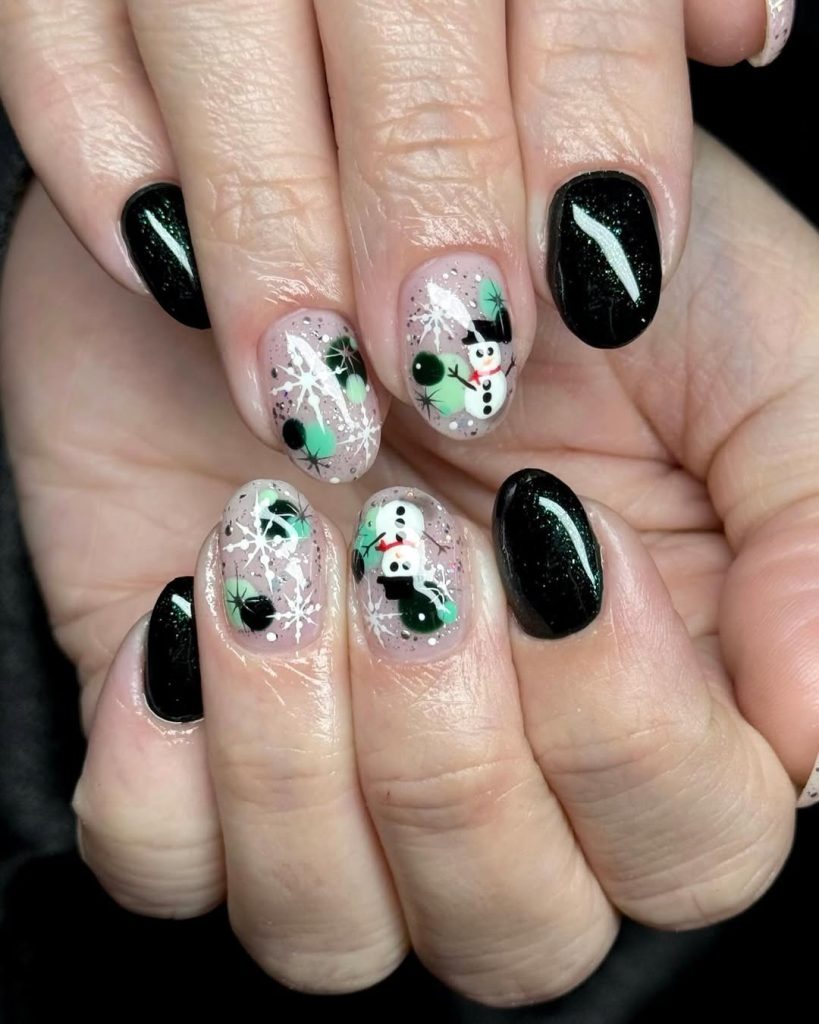 With snowmen, snowflakes, and scattered evergreen details, this manicure feels like stepping into a magical winter wonderland. The deep green and black bases add contrast, making the snowy details shine.