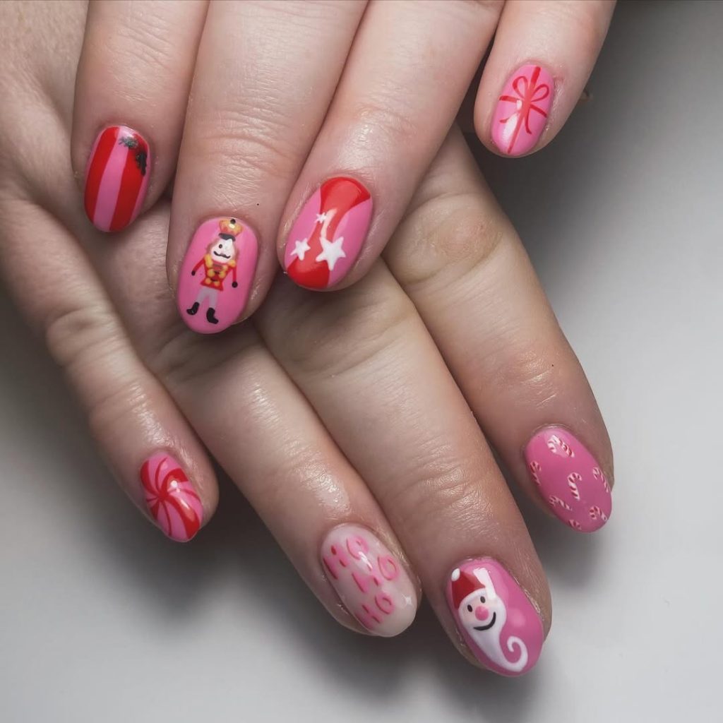 With pink bases, candy canes, gift bows, stars, and a charming nutcracker, this manicure adds a playful twist to holiday classics. It feels whimsical and lighthearted, offering a youthful spin on Christmas nail art.