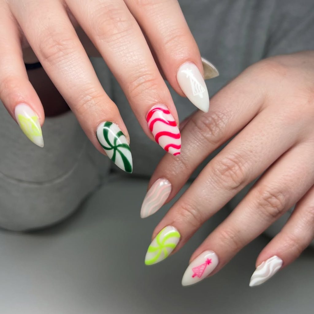 Best for long stiletto nails, this look shines with gel polish that makes the neon colors pop. It’s a great inspo set for anyone wanting something more edgy and trendy while still keeping a festive spirit.