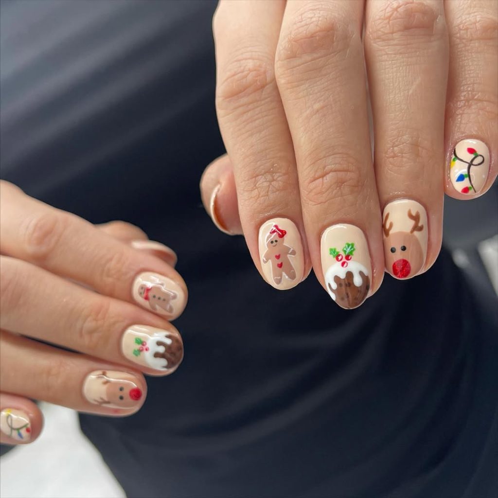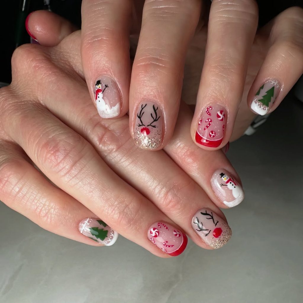 This look works beautifully on short or medium round nails. The art designs are simple yet detailed, making them a low-maintenance inspo option for those who want holiday fun without going too bold.