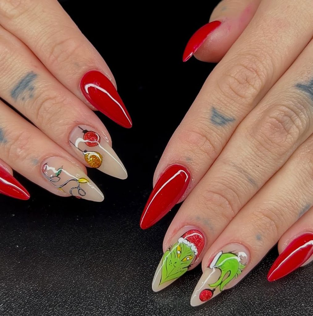 For anyone with a cheeky side, this Grinch-inspired set is pure holiday fun. Bright red nails pair with playful Christmas lights and bold Grinch faces, striking the perfect mix of sass and festive flair.
