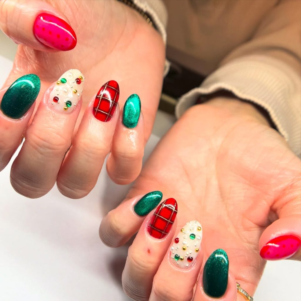 These fun Christmas nails 2025 are best done on almond shapes to showcase the plaid and pearl-like ornament accents. Gel polish brings out the shimmer, while the raised details add texture. It’s a great inspo choice if you want nails that feel like part of your holiday outfit.