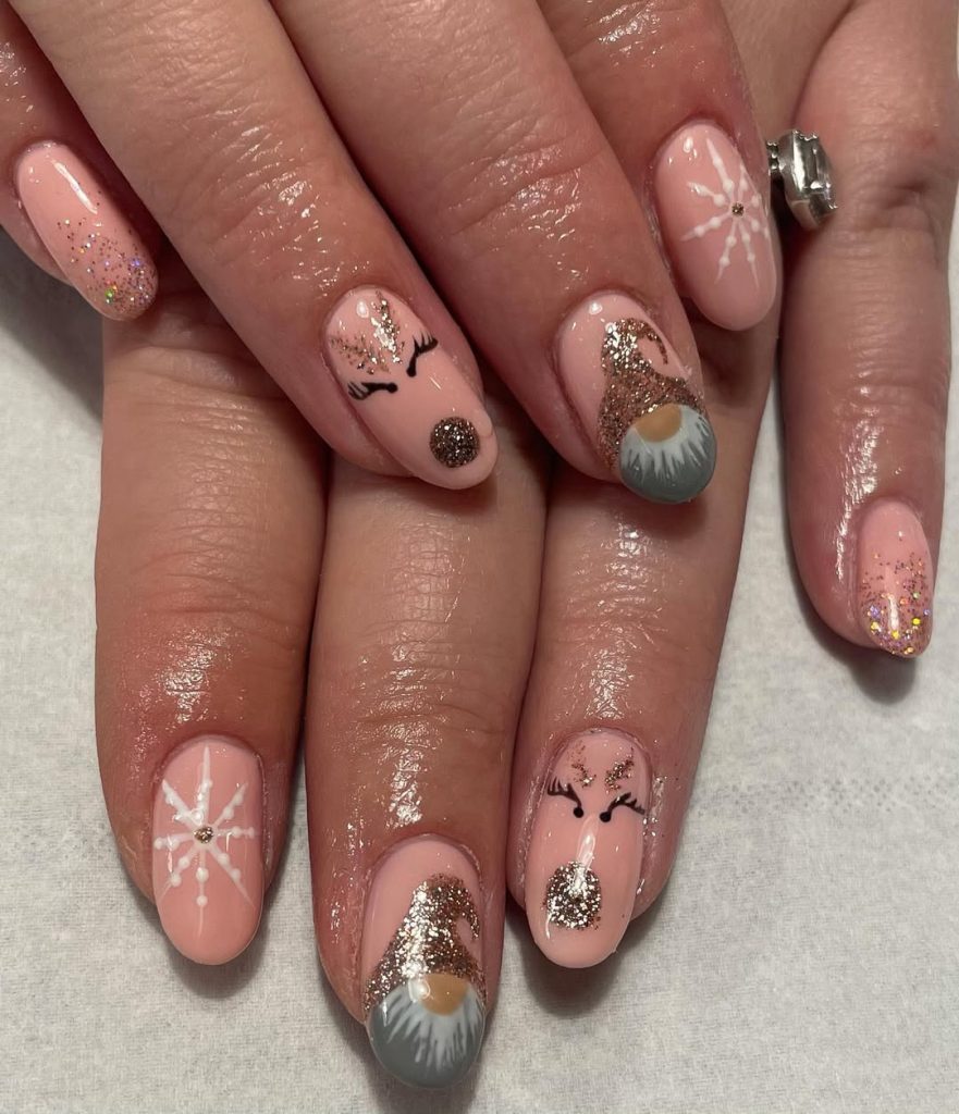 Soft blush pink nails become whimsical with sparkling reindeer faces, glitter accents, and snowflakes. The design feels delicate yet festive, capturing the charm of frosty mornings and cozy nights by the fire.