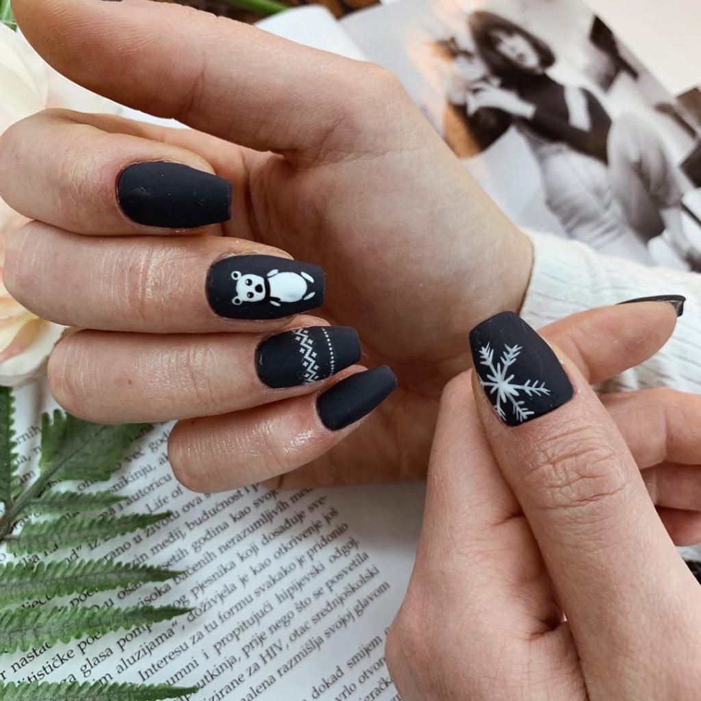 There’s something delightfully unexpected about matte black nails dressed up with a cheerful penguin and delicate snowflake designs. It’s bold, modern, and gives off a cozy winter night vibe, perfect for someone who wants to stand out without losing the seasonal spirit.