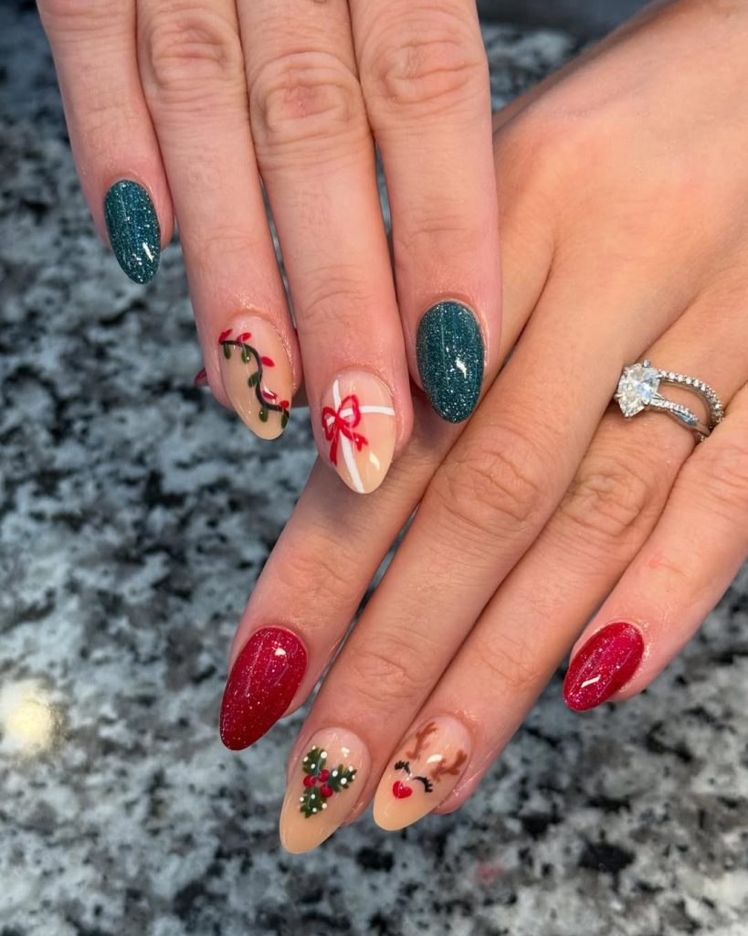Glittery green and red paired with tiny Christmas lights and reindeer faces bring all the holiday vibes to this design. It feels like decorating your nails as if they were part of the Christmas tree, instantly lifting your mood every time you glance down at your hands.