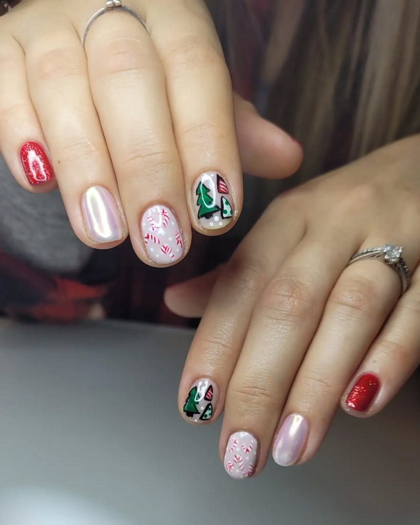 This manicure mixes elegance with festive whimsy, pairing red sparkles, iridescent shimmer, and tiny candy cane art with playful Christmas tree designs. It’s a fun balance of bold and subtle, offering that instant holiday feel without being too over the top.