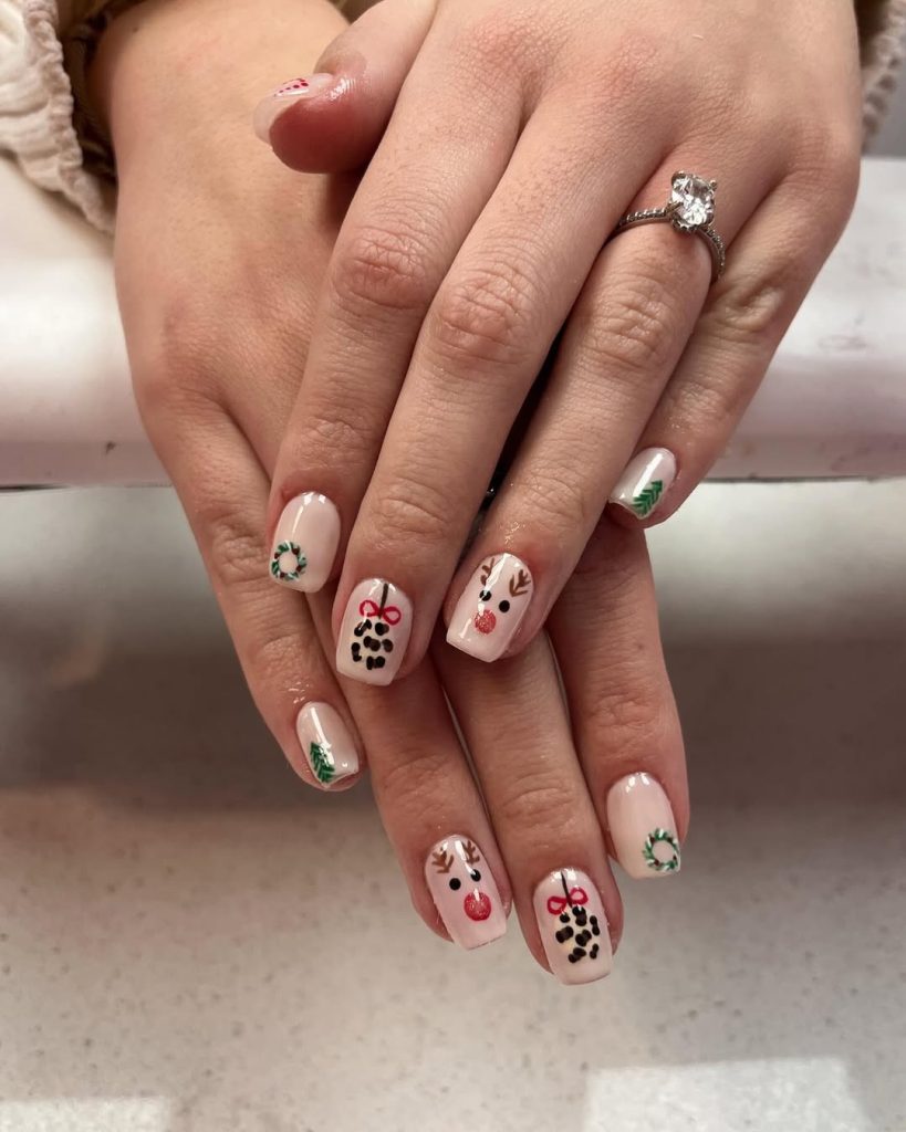Perfect for short square nails, this design is simple but eye-catching. It’s an easy inspo look for someone who loves festive art designs yet prefers a softer color palette. Plus, the nude background makes the red and green accents pop beautifully.