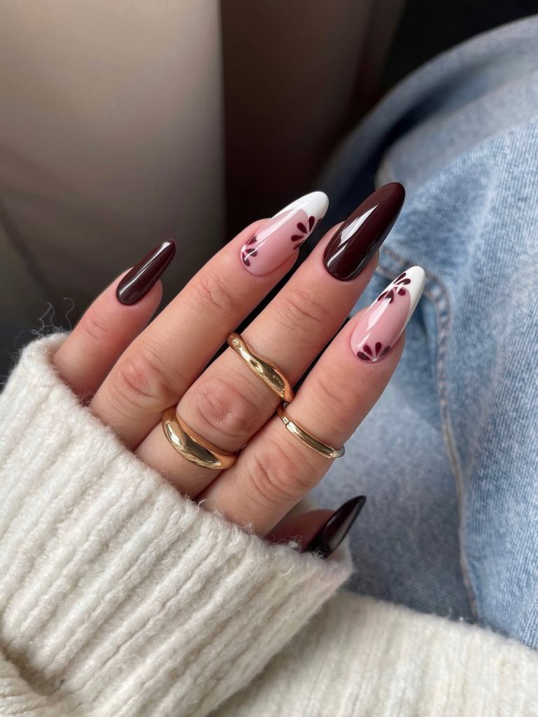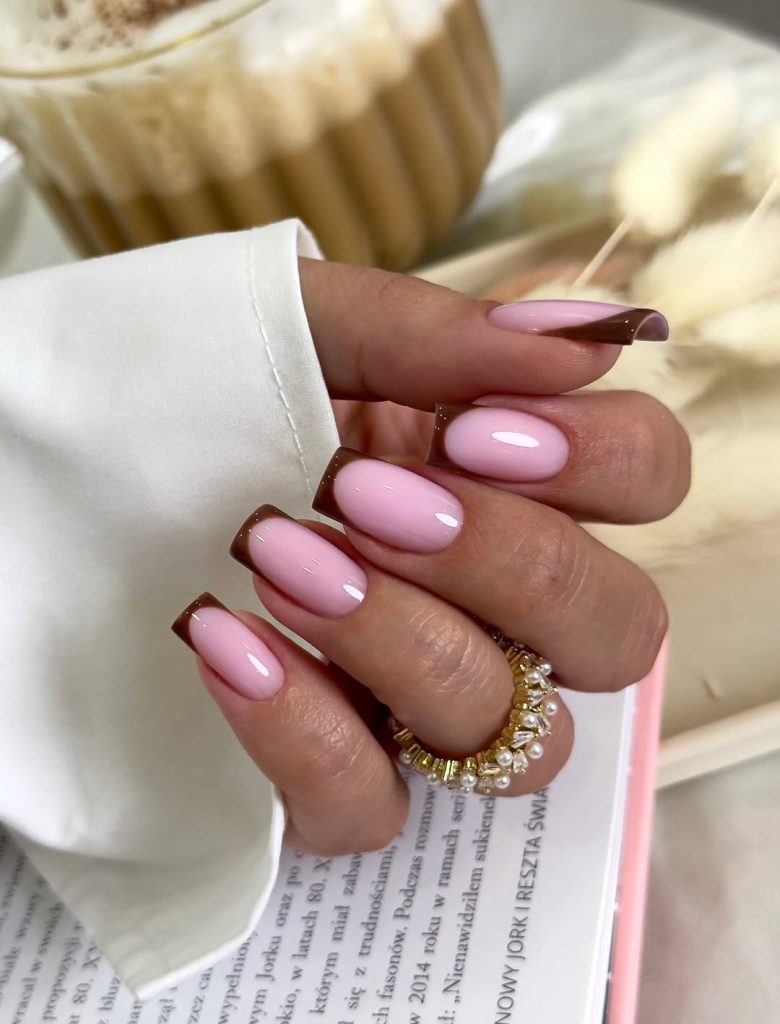 Chocolate brown french tips are really having a blooming minute, and these glossy square nails exemplify just how trendy the look can be. Worn over a delicate pink base, it feels bold but chic—like a fashionista spin on the typical french manicure. It’s chic but not over-the-top, making it a great inspo look for cooler seasons.