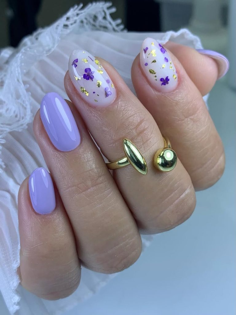 It’s a gel nail look that feels like a flower-filled spring garden preserved in polish—light lavender alongside dainty white bases studded with purple flowers and gold glitter. It’s a floral, fairy-tale-inspired design that automatically lends your hands a more feminine, artistic look. Blending pastel hues with metallic sheen hits a note between cute and chic.