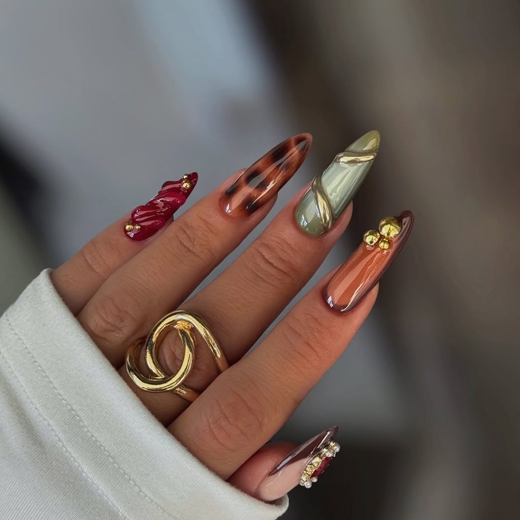 This manicure is pure inspo for anyone who loves bold designs. Each nail tells its own story—from tortoiseshell patterns to sage green polish with golden accents, deep red swirls, and metallic details. Together, they create a gallery of textures and colors that feel straight off a runway.