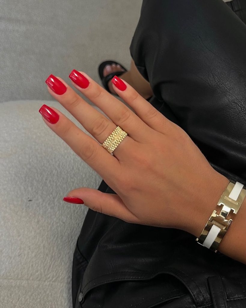 Shorter square nails make this look practical and easy to maintain while still keeping the drama of the red. It works for every season, every outfit, and every mood—a true classic that never loses its charm.