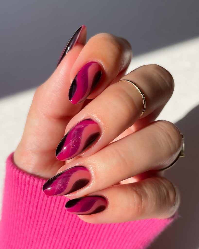 Artistic, bold, and irresistible, pink and black swirl gel nails feature pink and black together in twisted designs across a high-gloss base. It’s a look that’s dramatic yet feminine, inspo that just feels ideal for someone about to make a statement.
