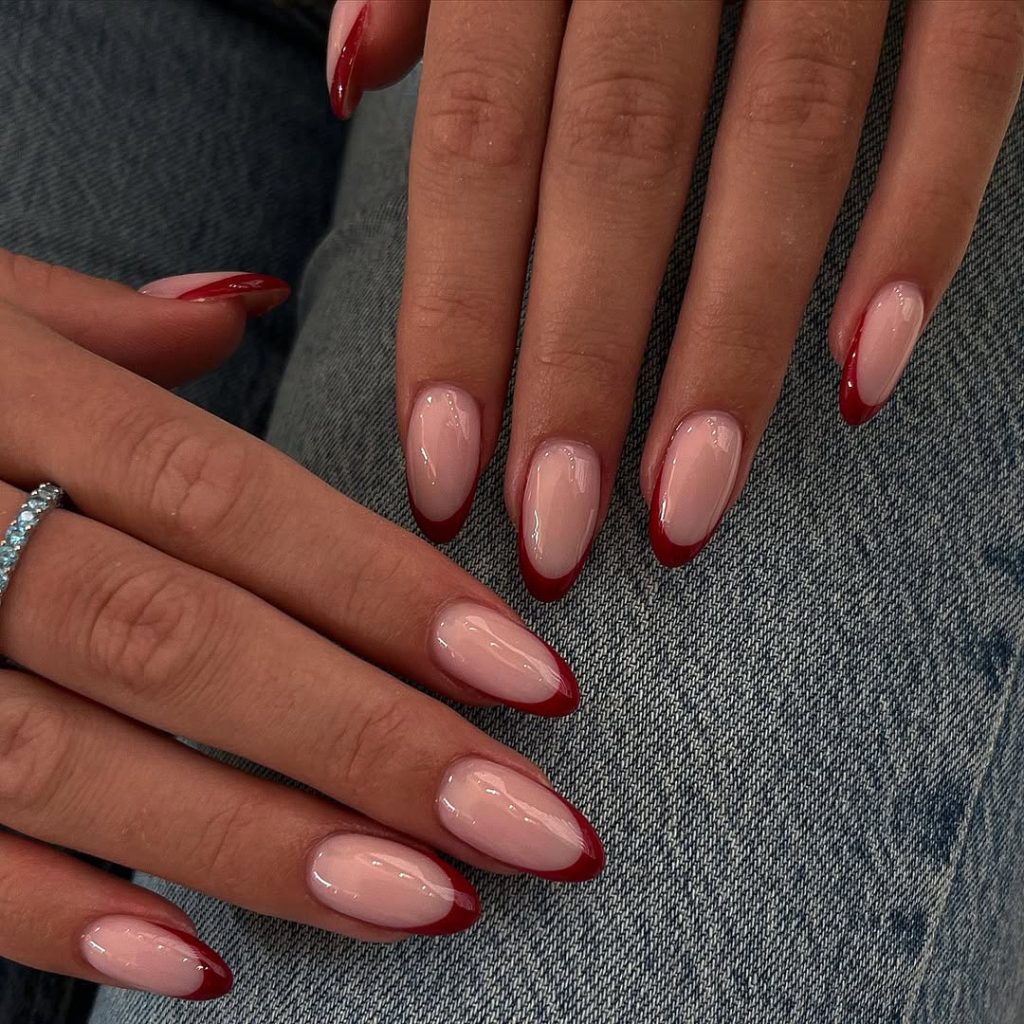Timeless with a twist, these are classic red french tip gel nails with a glossy red tip on a nude background. Bold but sophisticated, it pairs classic french with red polish confidence. It’s sexy, sophisticated, and always trendy.