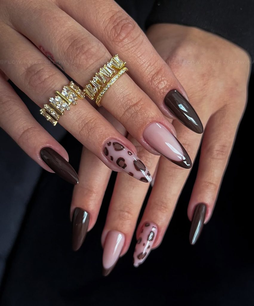 Blending animal print-themed artwork with a high-gloss finish, this nail set combines brown hues with leopard prints. It’s a gritty but still wearable look that strikes just the right note between trendy and timeless. With the changing of accent nails, the entire set remains intriguing but refrains from overdoing it.