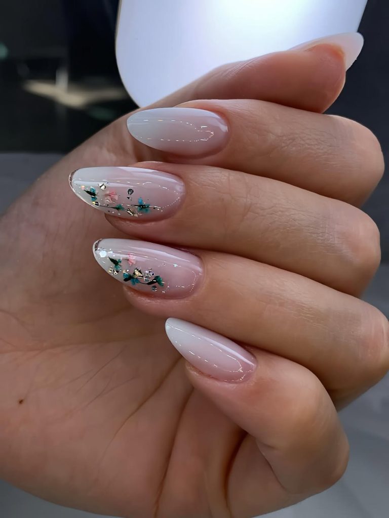 These gel nails feel like a breath of spring. The soft gradient polish lays the perfect base for tiny floral accents that seem to bloom right across the fingertips. A mix of metallic flecks and tiny blue and pink details add just enough sparkle to catch the light beautifully. The look is playful and cute without losing sophistication.