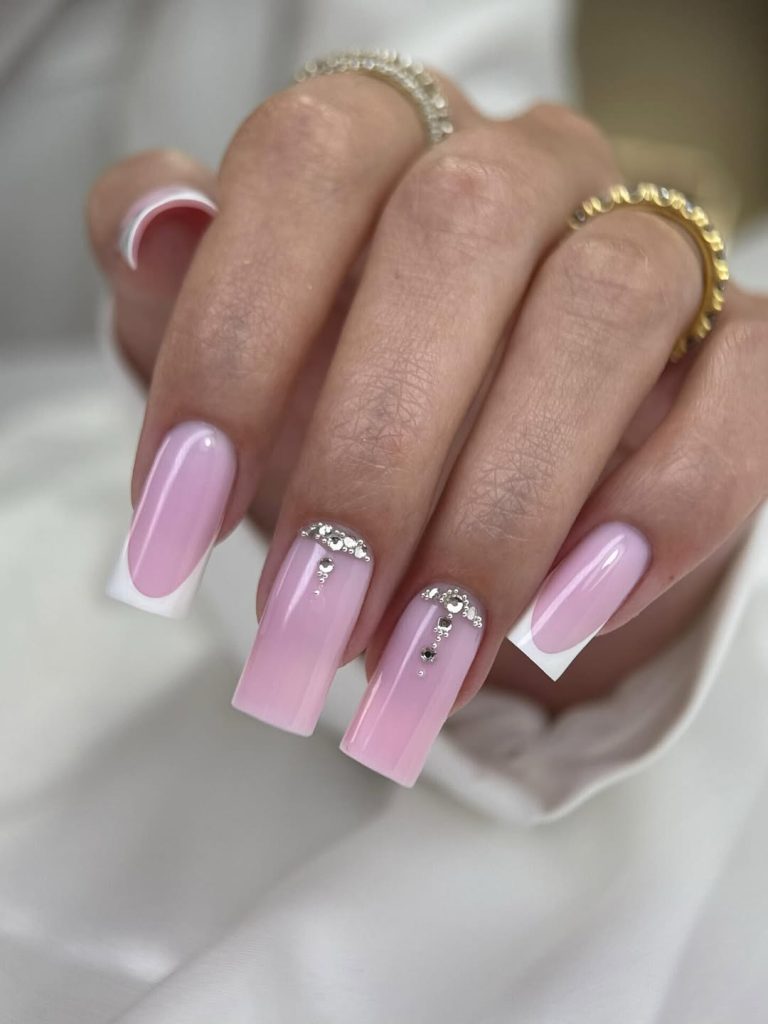 If you’re feeling sassy, these pink ombré nails with rhinestones inject just the right level of sparkle. The transitioning from pale pink to white feels romantic, but the gems provide a pop of evening-going drama. It’s feminine but sophisticated, providing that ideal inspo for an evening out or a special occasion.