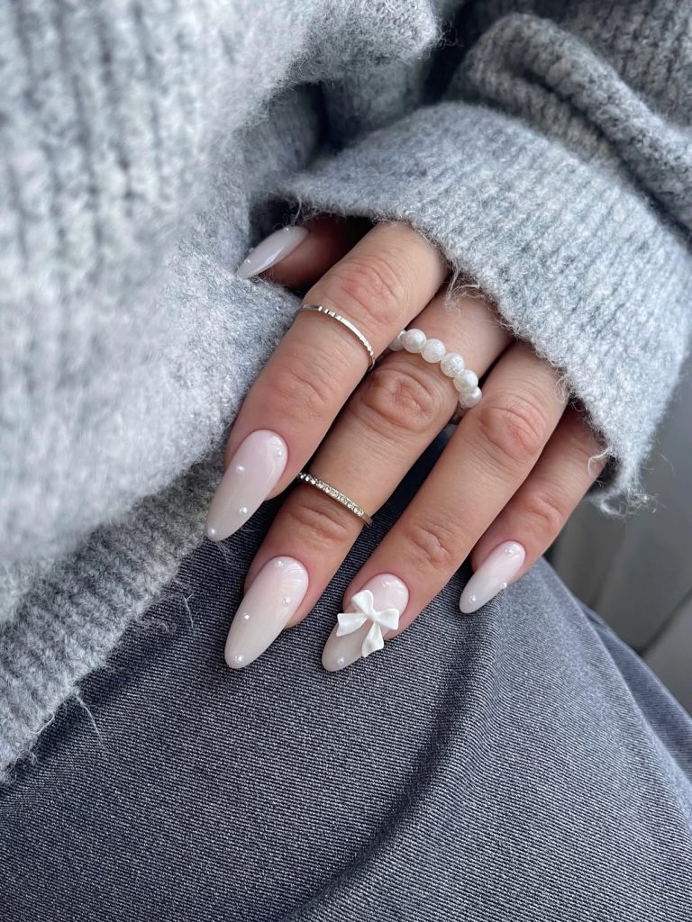 This manicure is like opening a present—delicate nude polish, minuscule pearl-dot accents, and a subtle 3D bow perched on the ring finger. It’s delicate, feminine, and automatically eye-catching but not overdone. The look has a blossoming charm, that sort of grace that just causes you to move a bit more elegantly with each hand gesture.