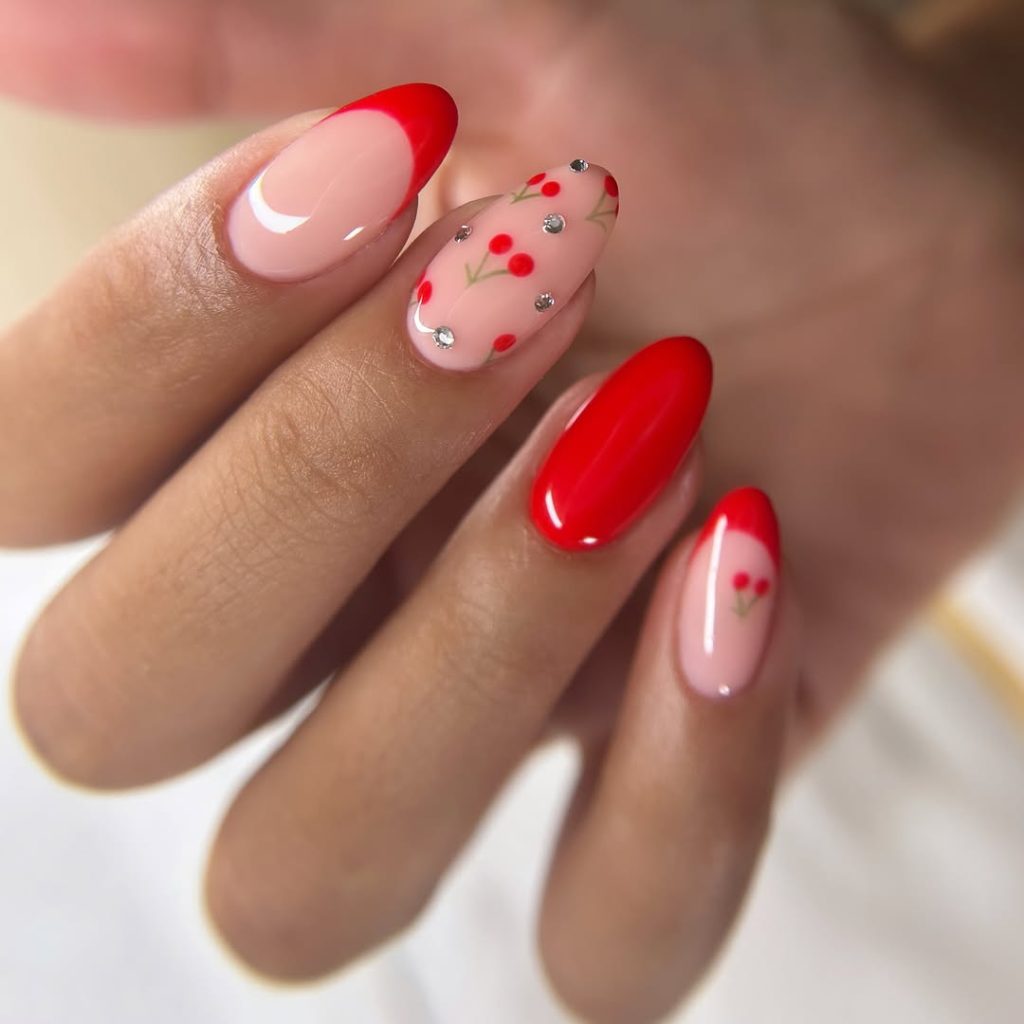 Fruity, fresh, and flirty—these cherry-gel-inspired nails are a slice of fun. Fruit art designs are laid out across a nude base, with red French tips that work perfectly with this look. Some sparkle happens with added rhinestones, but it lands on this side of over-the-top. It’s that cute, fun manicure that always gets a big smile out of you when you glance down at your fingers.