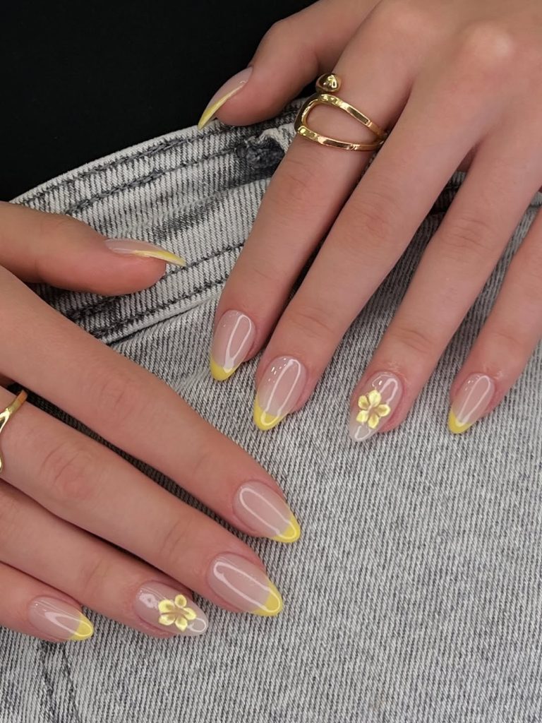 This design works especially well for women who love easy yet striking ideas. The almond shape gives the tips room to shine, while the flower detail adds a special twist. It’s also low-maintenance since the nude base makes growth less noticeable. Ideal for anyone who wants pretty nails with a fun seasonal edge.