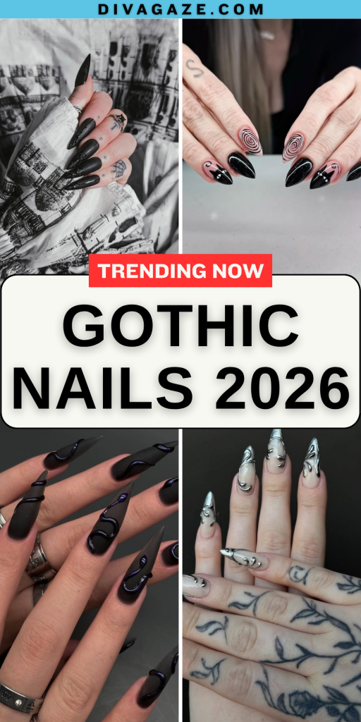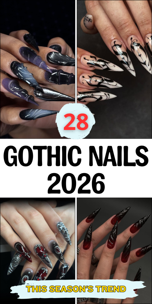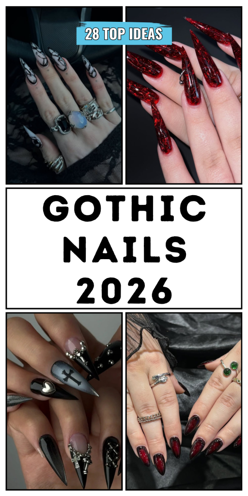 Perfect for women who want something unique, these nails are ideal for long almond shapes. They pair beautifully with both edgy and playful outfits, proving Gothic nails can embrace color while staying true to their mysterious vibe. They’re bold, creative, and a reminder that Gothic ideas in 2026 are about reinventing tradition.