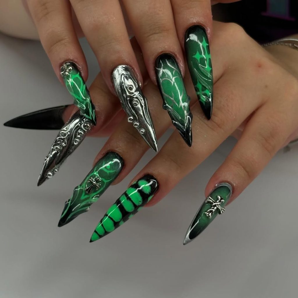 This look is perfect for long almond nails and those who want to experiment with color beyond the usual black or red. Green is a growing trend in Gothic designs, giving fresh inspo for summer and beyond. They work especially well with silver jewelry and darker outfits, making them a bold yet wearable Gothic statement.