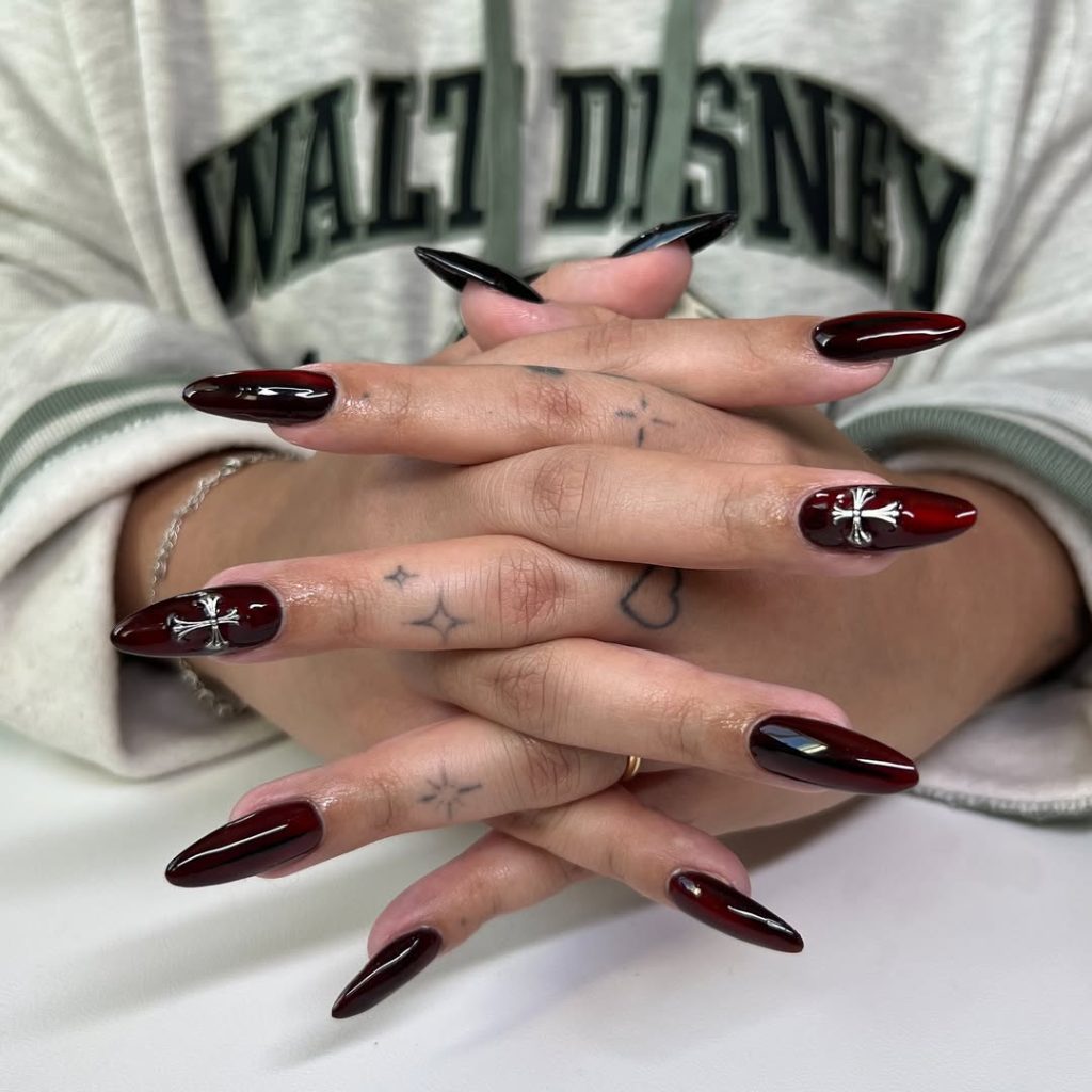 Sometimes the most powerful Gothic looks are the simplest. These deep ruby red nails with sleek almond tips have a glassy shine that feels like liquid velvet. With just a touch of silver cross detail, they strike the perfect balance between subtle elegance and dark inspo. It’s Gothic beauty without the fuss — dramatic but wearable.