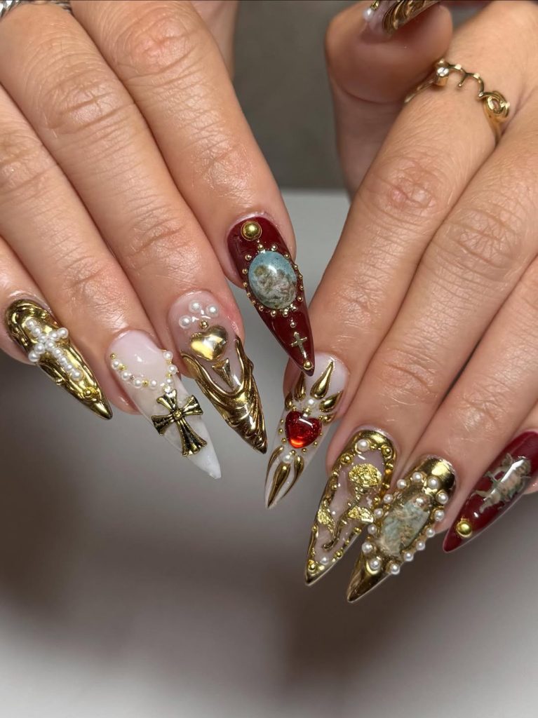 These look like Gotham treasures taken right from fairy Gothic cathedrals. Golden crosses, pearls, heart-shaped jewels, and even miniature paintings adorn these nails to the extremes of Gothic designs. It’s lavish, theatrical, and loaded with meaning, each nail serving as a miniature canvas of Gothic beauty for the witch.